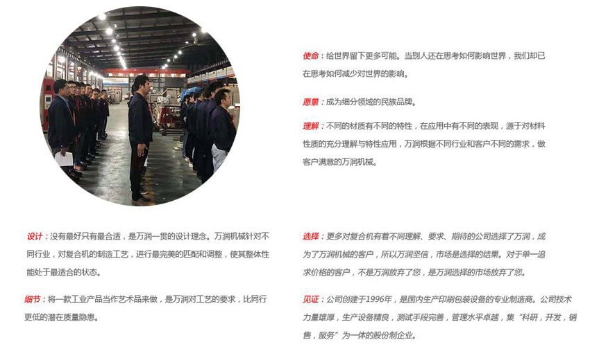 溫州萬(wàn)潤(rùn)機(jī)械有限公司(原瑞安市意聯(lián)機(jī)械有限公司)位于浙江省最前沿的東海之濱瑞安市。距機(jī)場(chǎng),火車站30多公里,緊靠104國(guó)道,交通便利。公司創(chuàng)建于1996年,是國(guó)內(nèi)生產(chǎn)印刷包裝設(shè)備的專業(yè)制造商。